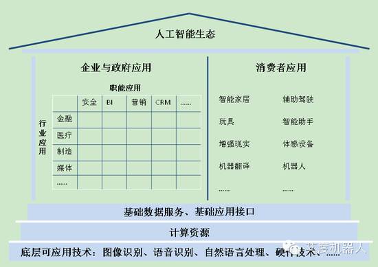 人工智能的三步走 人工智能的整个发展历程来看,按照应用场景和人工智能资源集中度可以大致分为三个阶段; 第一阶段:实验研究阶段 第二阶段:企业应用阶段 第三阶段:个人应用阶段 人工智能的产业生态 人工智能生产主要由底层可应用技术(图像识别,语言识别,自然语言处理,硬件技术)、计算资源(大规模CPU集群)、基础数据服务、以及企业、政府、消费者应用组成,遵循产业的一般发展规律,人工智能的发展路径已然从底层的可运用技术成熟开始,再到商业话计算资源,数据服务等基础设施的完善,最后形成企业和消费者应用的繁荣。我们需要注意的是三方面的资源: 1、底层可运用技术的突破 2、中间的数据和计算资源利用的进步 3、基于现有技术应用场景的发掘 SEE MORE → 艾 度 机 器 人